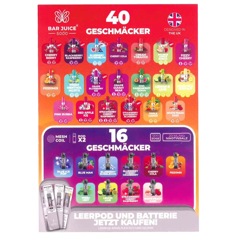 Ja, das Werbematerial ist generisch gestaltet, um die gesamte Produktlinie der Bar Juice Pods und Liquids optimal zu bewerben.