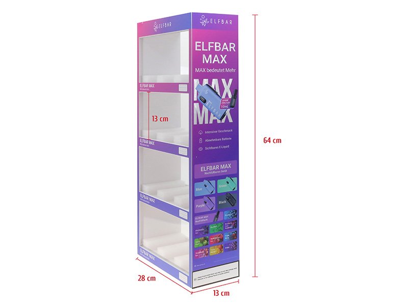 Mit einer Gesamthöhe von 64 cm, einer Breite von 28 cm und einer Tiefe von 13 cm ist dieses Display ein echter Blickfang. Es nutzt die Höhe optimal aus, um eine große Menge an Produkten auf kleiner Standfläche zu präsentieren. Das glasklare Acryl sorgt dafür, dass die Blicke deiner Kunden direkt auf die Produkte der Marke Elfbar gelenkt werden.