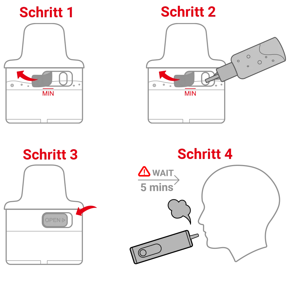 Hinweis: Nach der Erstbefüllung des Tanks mit Liquid bitte mindestens 8-10 Minuten warten, um einen Dry-Hit zu vermeiden.
