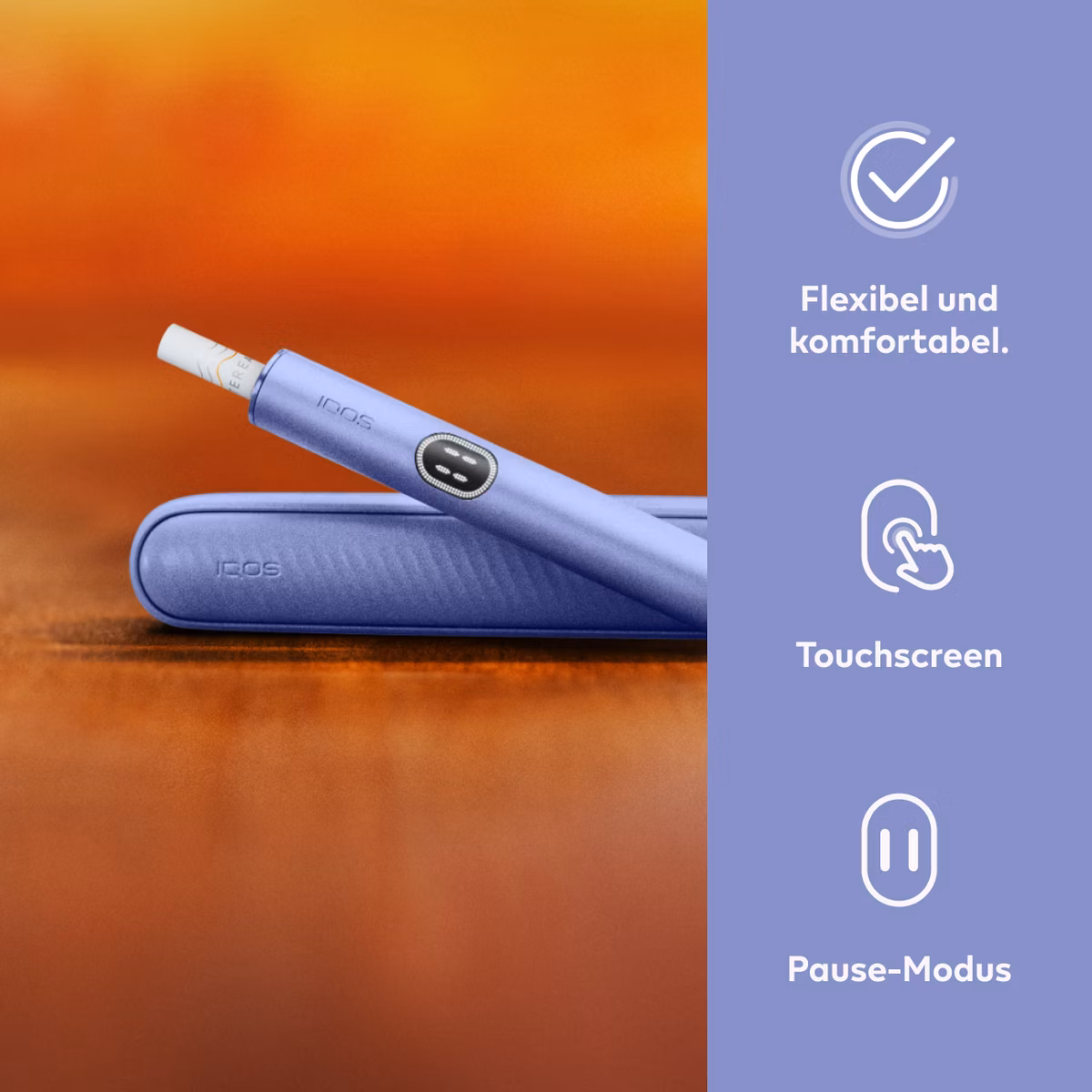 IQOS ILUMA i bietet zusätzliche Features wie den Touchscreen, den Pause-Modus sowie FlexPuff und FleyxBattery. Diese sind in der regulären IQOS ILUMA Version nicht enthalten.