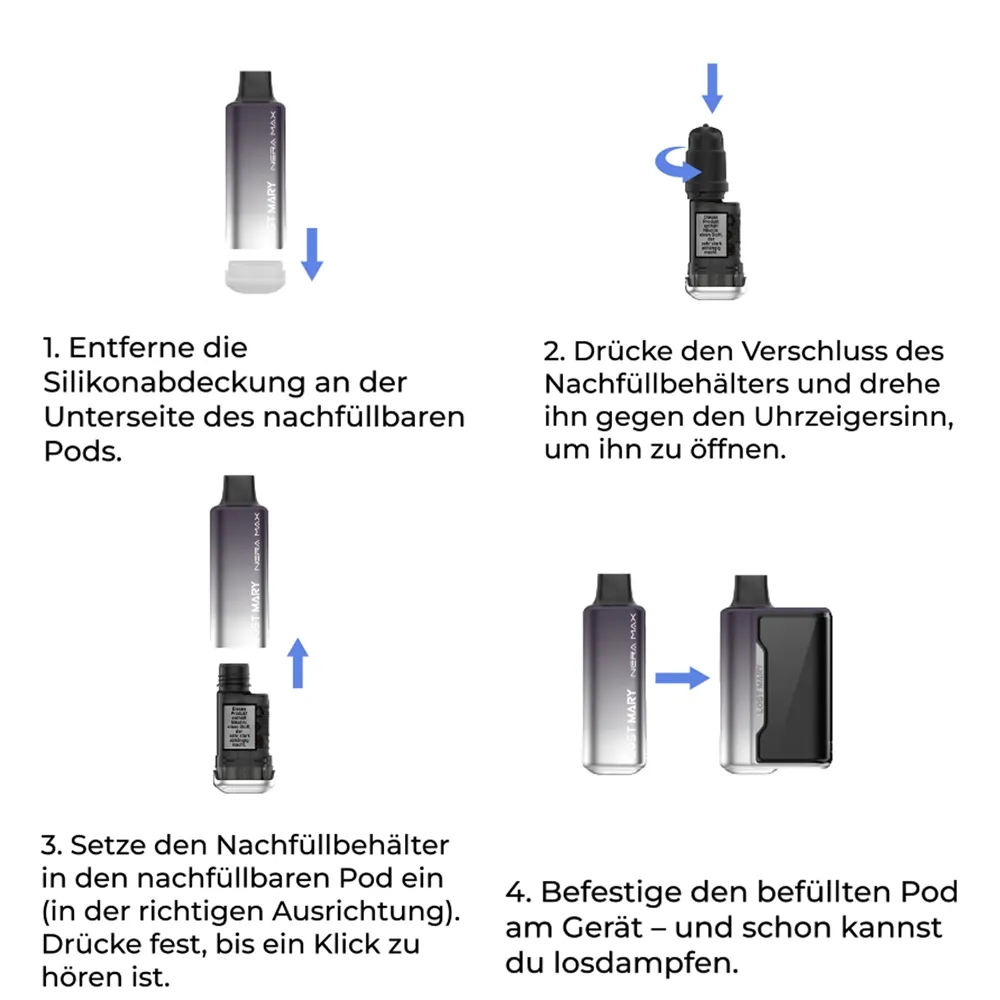 Wichtig: beim ersten Betrieb bitte eine Minute warten bis das Liquid aus dem Nachfüllbehälter in den Leerpod geflossen ist, um einen verbrannten Coil / Geschmack zu verhindern. Der Nachfüllbehälter sowie der Leerpod ist nur für den einmaligen Gebrauch benutzbar.