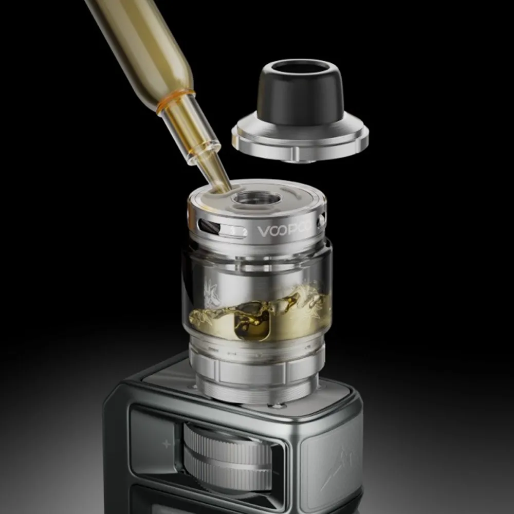 Der zum Kit gehörende Uforce-X Tank 2 ist aus langlebigem Edelstahl und Borosilikatglas gefertigt und wurde primär für dichte Wolken und geschmacksintensive Züge entwickelt. Das Tankvolumen beträgt großzügige 5.0 ml, befüllt wird bequem über das praktische Top-Fill System mit Bajonettverschluss. Die auslaufsichere Top-AFC mit drei Lufteinlässen erlaubt eine präzise Anpassung des Luftstroms von offenem DL bis hin zu restriktivem RDL.